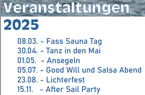 Wie jeder größere Verein gibt es auch bei uns verschiedene Events. Dabei sind vereinsinterne Veranstaltungen (Heringsstippessen, etc.) aber auch öffentliche Veranstaltungen, die jedermann offenstehen (Tag der offenen Tür, etc.).